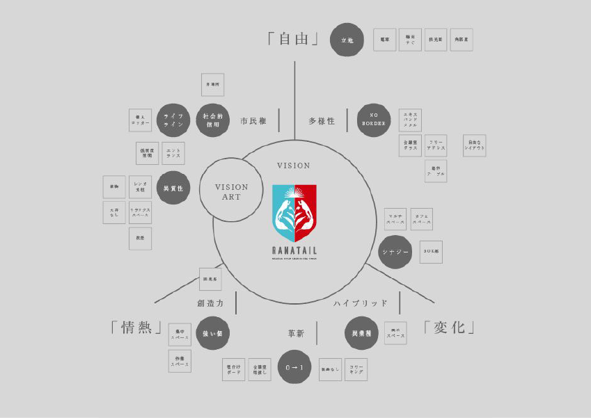 社長様のヒヤリングから始まり、ブレスト会議を3回、コンセプトワークを2回、行わせていただきました。想いの熱さだけでなく、明確な課題意識や未来へのビジョンをお持ちだったので、現在のスタッフ様の温度感や、社長様のイメージされている世界観を整理し、複数の事業がそれぞれ関連しながらも、1つの街になっている構図にてARTを描き出しました。